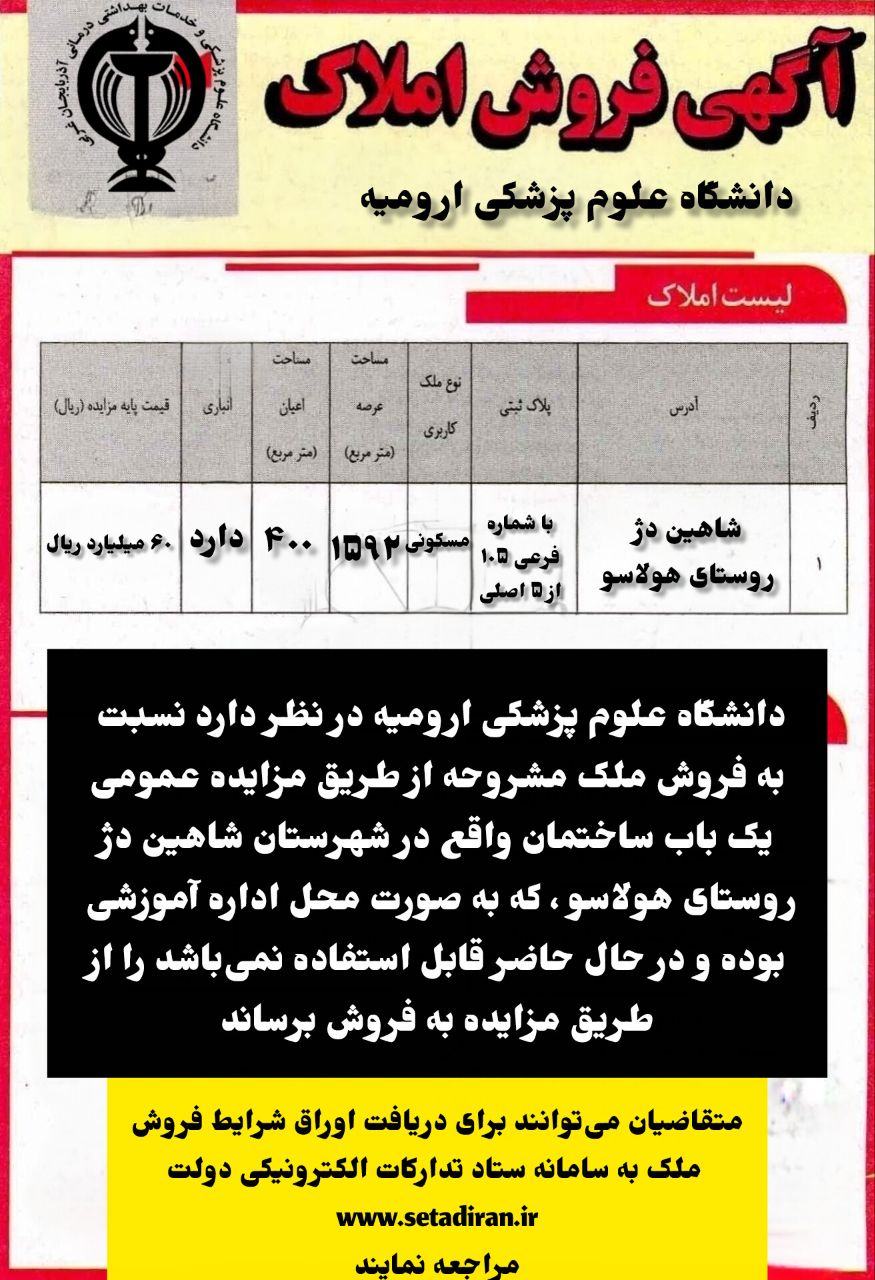 آگهی فروش آموزشگاه بهورزی شاهین دژ واقع در روستای هولاسو توسط دانشگاه علوم پزشکی ارومیه
